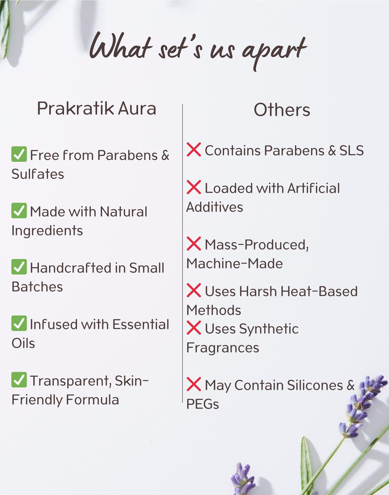 Unwind and refresh with Prakratik Aura’s Handmade Lavender Body Soap, crafted to provide a gentle and soothing cleanse. Infused with lavender essential oil, it calms your senses while nourishing your skin. Enriched with Aloe Vera and Vitamin E, this soap helps retain moisture, leaving your skin soft, hydrated, and delicately fragrant. Himalayan Pink Salt offers mild exfoliation, promoting a fresh and radiant glow. Free from SLS and parabens, it ensures a natural and skin-friendly cleansing experience.