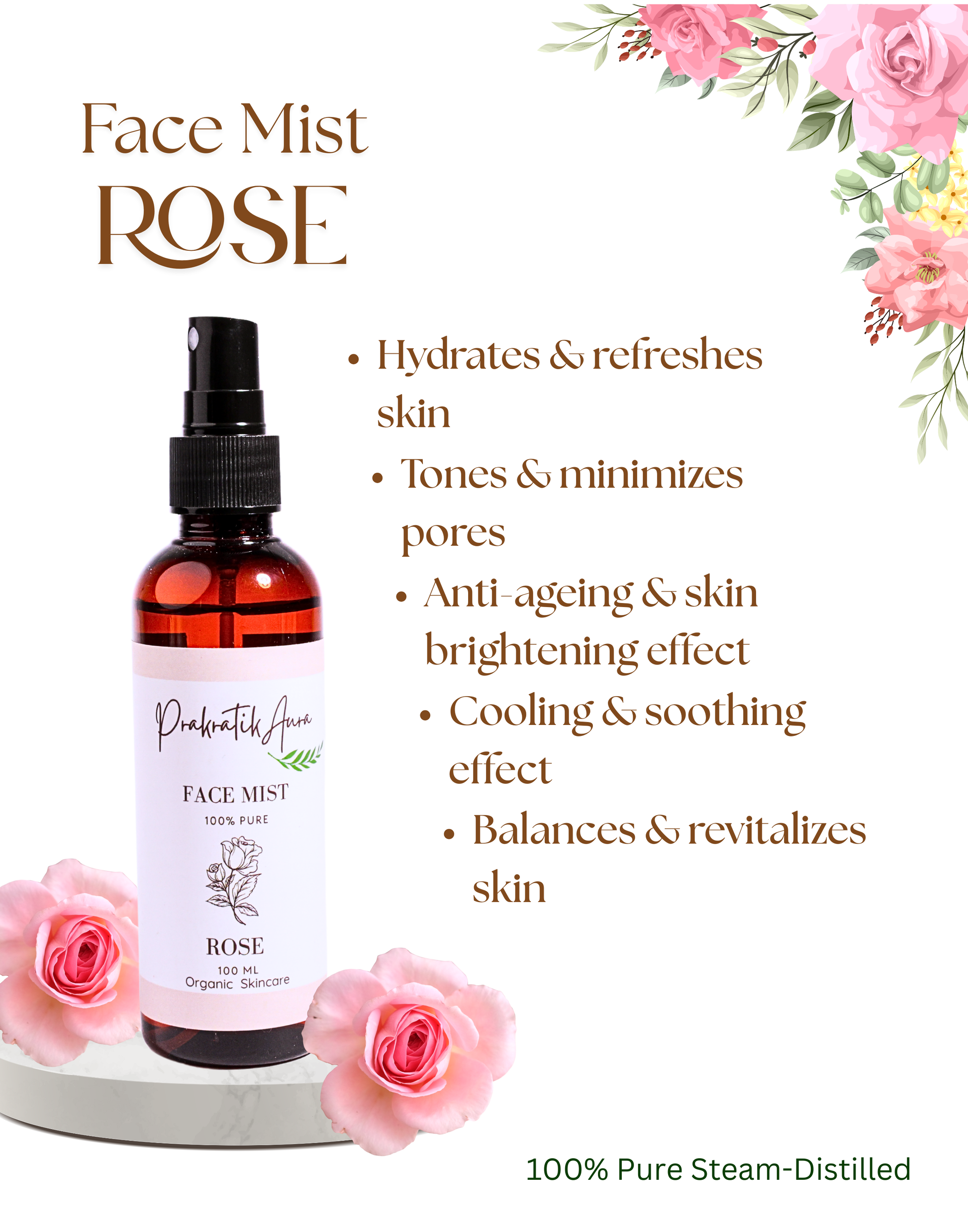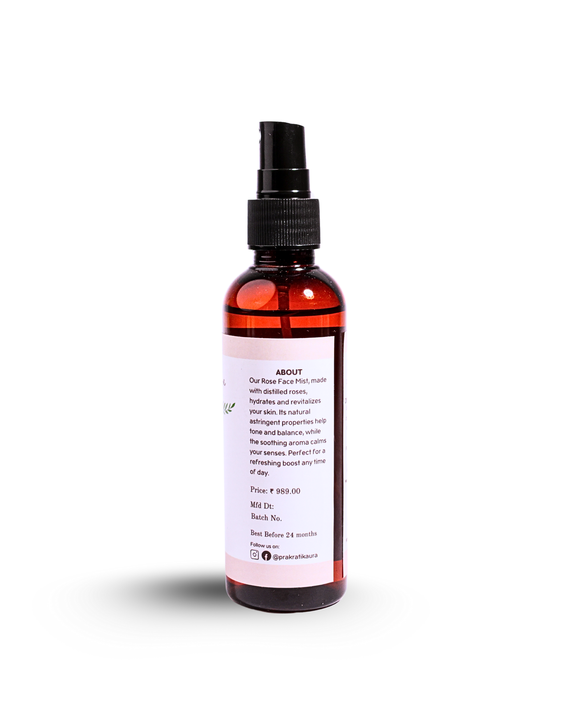 Refresh and rejuvenate your skin with Prakratik Aura’s 100% Pure Steam-Distilled Rose Face Mist, crafted from the finest Kannauj roses. This naturally hydrating and fragrant mist tones, rehydrates, and preps your skin, while helping to minimize enlarged pores. With each spritz, experience a cooling, soothing, and moisturizing sensation that leaves your skin feeling refreshed, balanced, and revitalized.